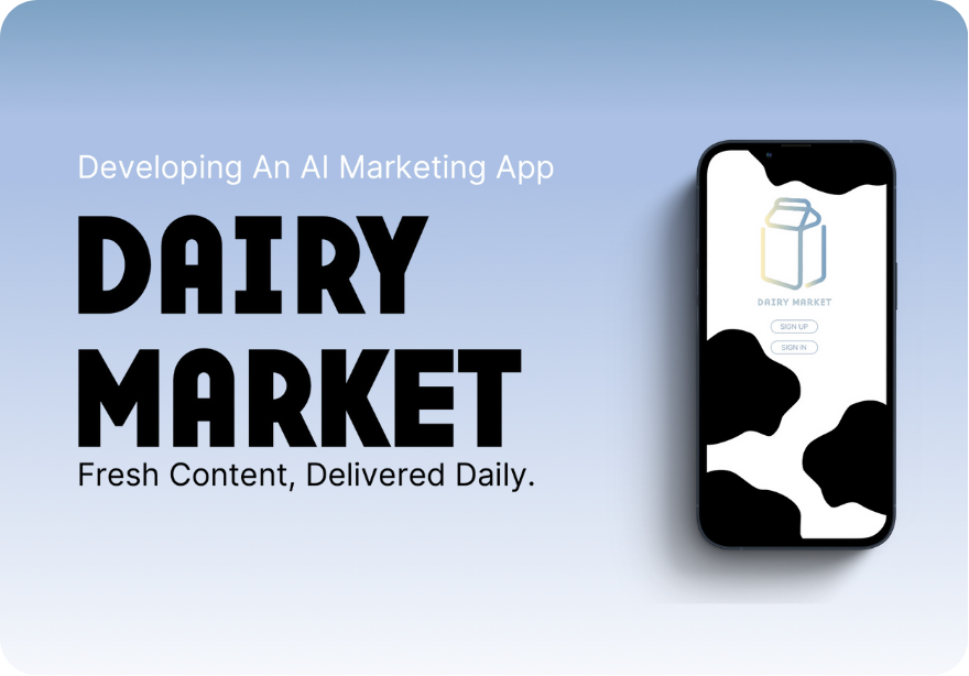 Our Dairy Market team initiated the development of an AI-integrated application for iOS devices with the objective of assisting small businesses that lack marketing resources to generate customized social media content. The application was constructed using XCode and incorporates the OpenAI API and a Firebase database, resulting in a fully operational iOS application. To ensure optimum user experience and brand development, we employed industry-standard design software such as Adobe Illustrator, Adobe Photoshop, Figma, and Canva.